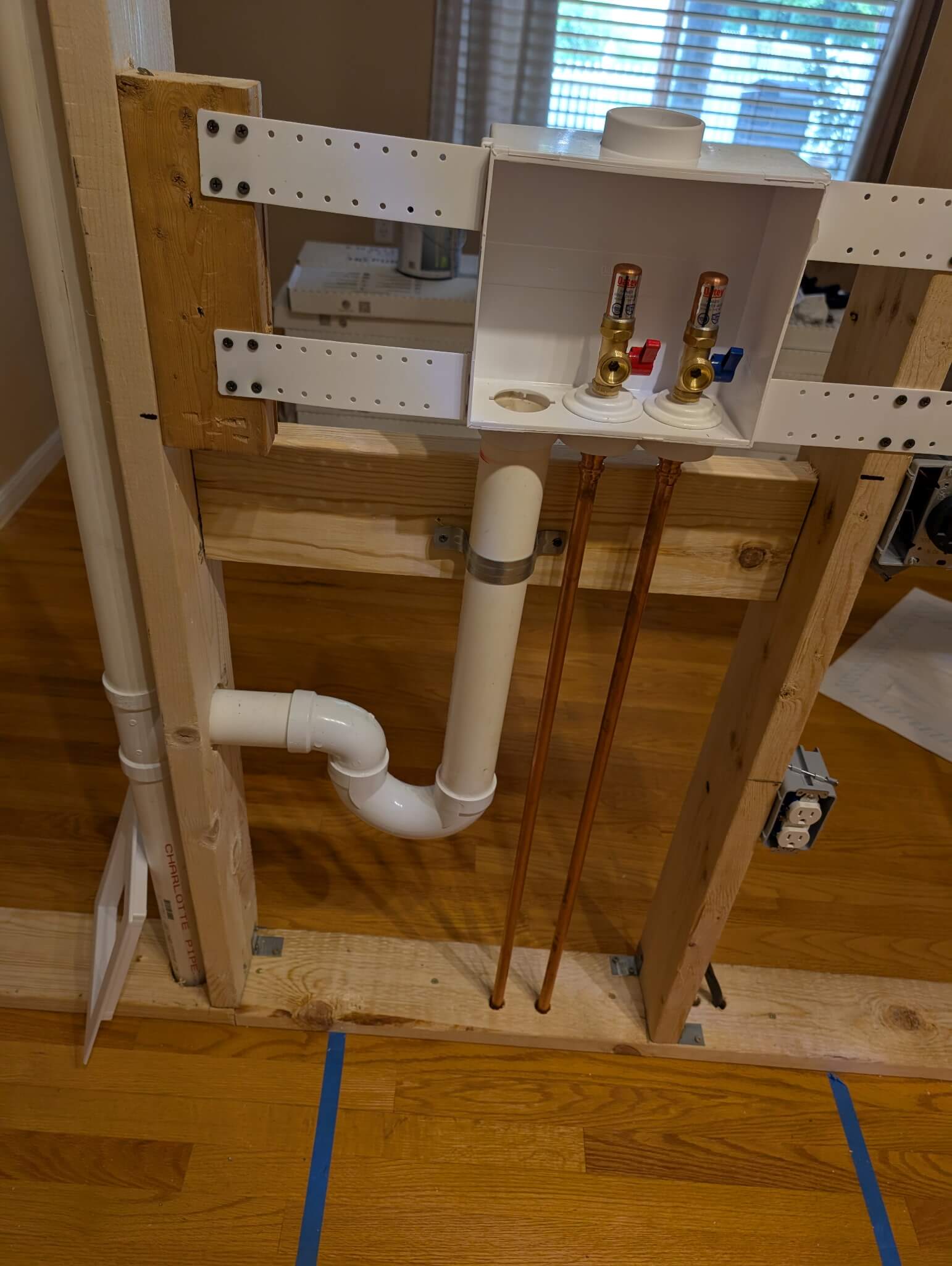 The box's design allowed him to fit the configuration to the new space quickly. After fastening the box to the studs, leveling it, and making the drain and water line connections in the basement, the job was completed in about 30 minutes.