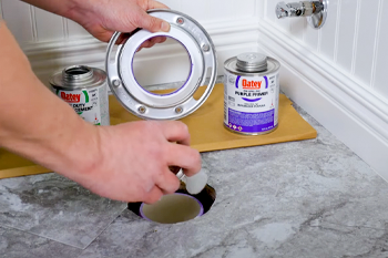 First, apply Oatey® Purple Primer to the flange and drainpipe using approved application methods. Then, apply Oatey® Heavy Duty Clear PVC Cement to the flange and drainpipe using approved application methods.
